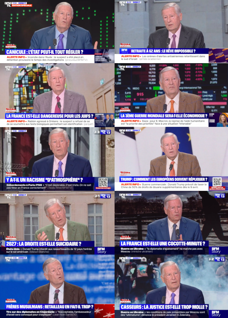 Après 60 ans de bons et loyaux services médiatiques, on aurait pu croire qu’Alain Duhamel allait enfin passer la main, comme il l’avait annoncé et comme sa femme l’avait exigé. Las… alors qu’il était théoriquement retraité depuis 2 mois déjà, il eut droit à une interview en pleine page dans le journal vespéral de référence (Le Monde, 7 sept. 2025). Mieux – ou pire – l’AFP (4 juil. 2025) nous informait au lendemain de sa retraite supposée que « dès la rentrée fin août, l’oncle de Benjamin Duhamel sera à l’antenne de la matinale de RTL tous les lundis à 09h10 pour commenter de grands thèmes d’actualité. Sur BFMTV, où il avait jusqu’à présent une émission quotidienne, il devrait intervenir le vendredi en fin d’après-midi ». Et les secousses politiques du moment ne sont pas de nature à nous rassurer puisque l’invité permanent des plateaux affirmait il y a quelques jours, un brin flagorneur, que « s’il se passe des choses importantes et qu’on me demande mon avis, surtout si c’est quelqu’un qui interroge bien… je vous dirai oui ». Tout récemment encore, il a élargi sa palette en intervenant dans l’émission « Quotidien » de Yann Barthès et semble donc plus que jamais parti pour rester. Laissons à France Duhamel le mot de la fin : « Ah oui, il a du mal à décrocher, c’est sûr… mais enfin il faudra que ça se termine, hein, vous êtes bien d’accord ? »
