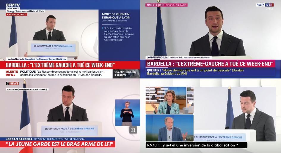 Le traitement médiatique n’a pas « seulement » occulté le contexte : il lui a instantanément préféré un cadrage articulé autour des liens réels ou supposés entre cette actualité… et LFI. Dès lors, le débat médiatique autour de la mort de Quentin Deranque s’est mué en véritable rouleau compresseur destiné à disqualifier, si ce n’est à criminaliser l’antifascisme en général, et LFI en particulier.