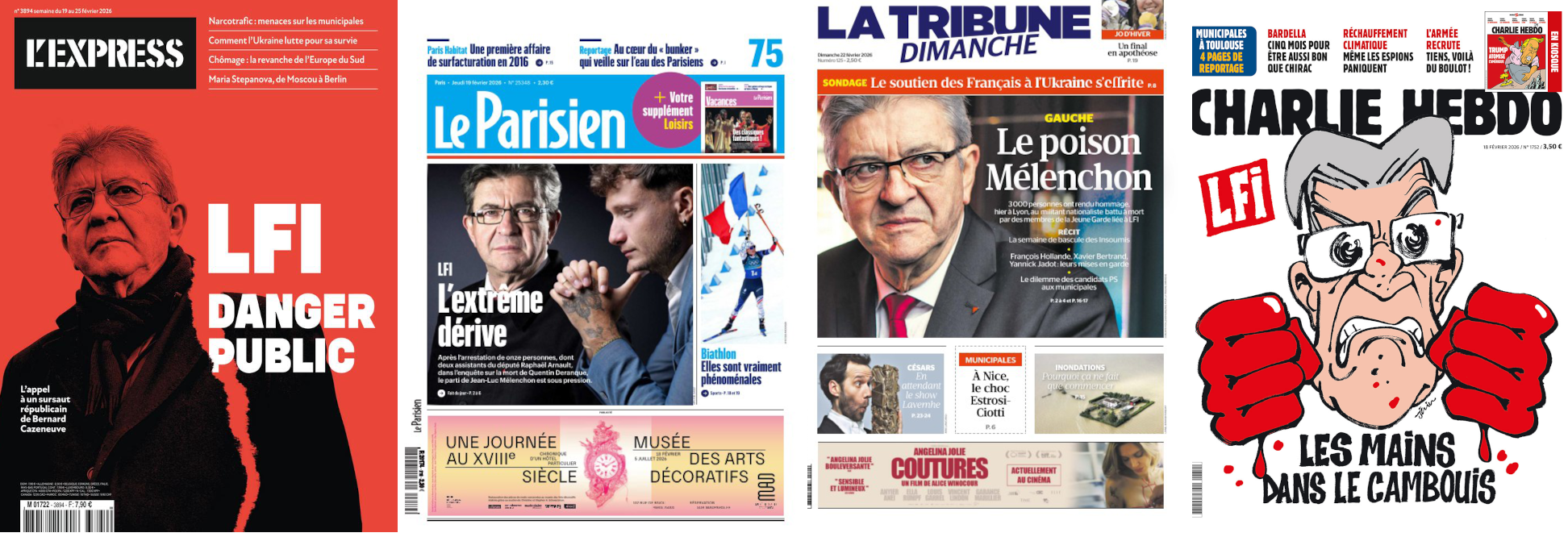 L’actualité a en tout cas donné une nouvelle vigueur à ce mantra journalistique déjà bien installé, et une nouvelle intensité à son matraquage. Il s’agit désormais de faire porter à La France insoumise la responsabilité non plus seulement d’un « discours violent », mais celle d’un homicide : « Aux soupçons d’antisémitisme, à la récente classification à l’extrême gauche, à la litanie des outrances verbales, s’ajoute désormais un mort. Celui de trop ? » (L’Opinion, 17/02) « Ils viennent de buter un mec », lâche sans retenue le chroniqueur Jérôme Lavrilleux sur RMC (17/02). LFI est un « danger public » en couverture de L’Express, en « extrême dérive » sur celle du Parisien ; Mélenchon est un « poison » à la Une de La Tribune dimanche et a du sang sur les mains dans Charlie Hebdo.