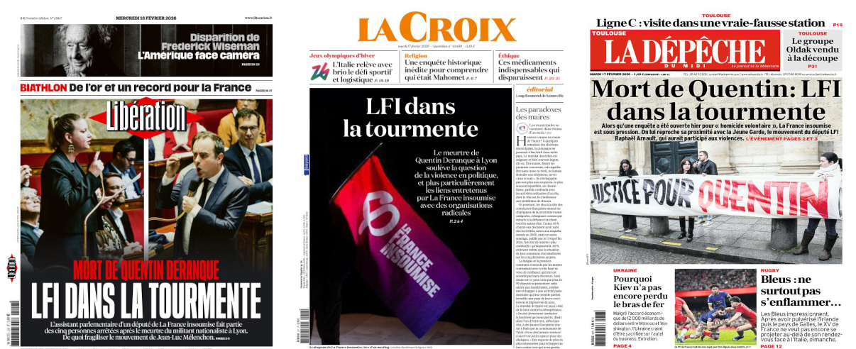 C’est une actualité qui a écrasé toutes les autres pendant une semaine entière : la mort de Quentin Deranque, militant néofasciste tué après une rixe avec des militants antifascistes, a totalement saturé le débat public. Les premières informations tombent un vendredi soir (13/02), en fin d’après-midi, et l’emballement est presque immédiat. Tout est réuni pour que les médias ne parlent plus que de ça : des vidéos accablantes ; un récit des événements installé par des petites vedettes de l’extrême droite médiatique ; l’implication potentielle de membres du collectif antifasciste (dissous) la Jeune Garde et de l’assistant parlementaire d’un député LFI ; des déclarations tapageuses émanant d’une très large partie du personnel politique.