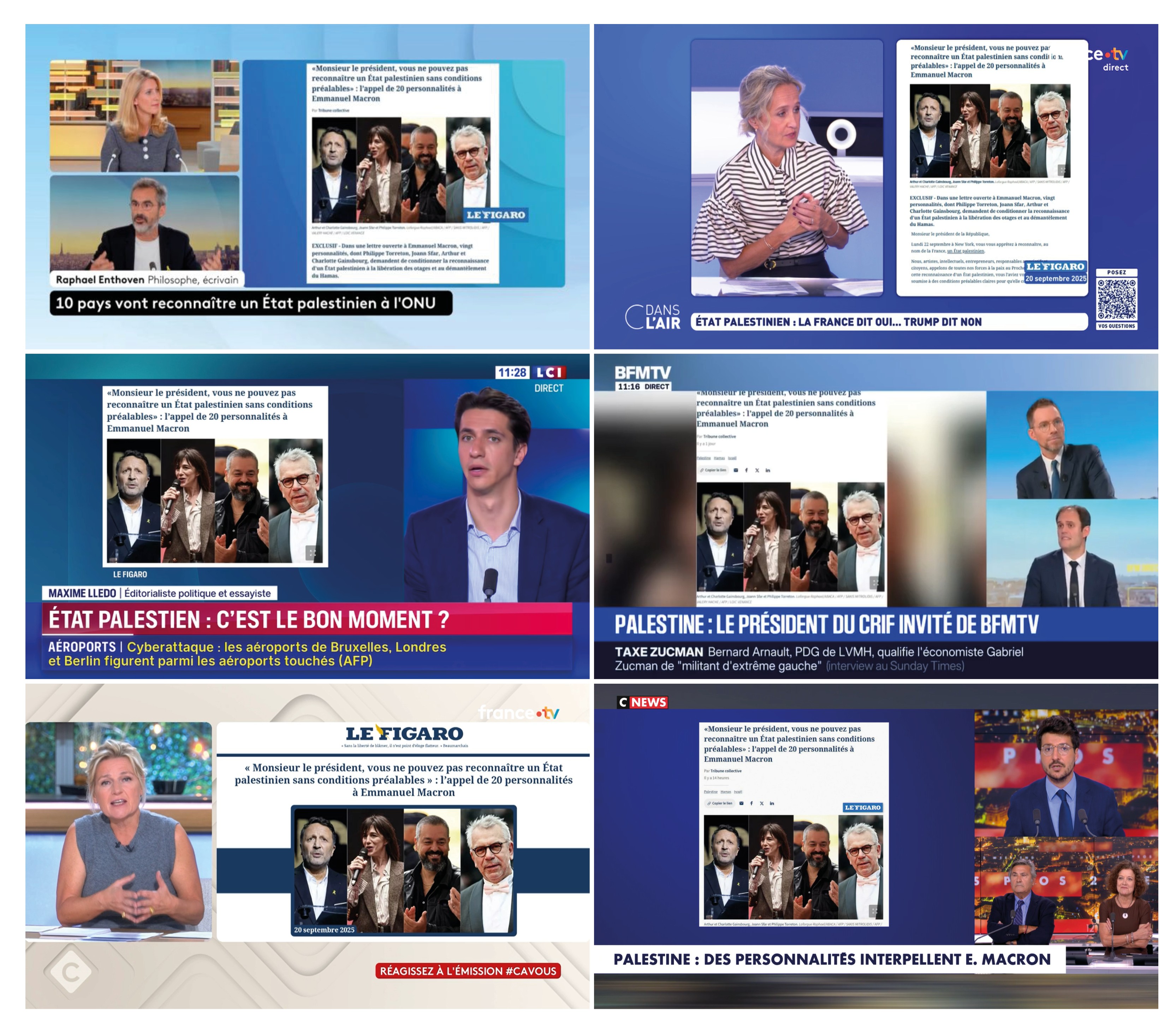 La notoriété et l’entregent des signataires garantissent au texte un très bel écho dans la presse, de Libération – « "Une victoire symbolique pour le Hamas" : des personnalités et des instances juives alertent Macron sur la reconnaissance d’un État palestinien » (19/09) au JDD (19/09), en passant par TF1 (20/09), Le Point (19/09), RTL (19/09), mais aussi Public (20/09), Gala (20/09) et les magazines du service public comme « C à vous » ou « C dans l’air ». Discuté sur l’ensemble des chaînes d’information en continu, « l’appel des 20 » fait l’agenda au point d’être relayé par les journalistes auprès des autorités compétentes [5]. Ainsi d’Adrien Gindre face à Jean-Noël Barrot, ministre démissionnaire des Affaires étrangères, dans la matinale de TF1 (22/09) : « Le chef de l’État a été interpellé ce week-end par vingt personnalités […] avec ces mots : "Affirmez […] que cette reconnaissance ne prendra effet qu’après la libération des otages et le démantèlement du Hamas." Alors, éclairez-nous : est-ce que la reconnaissance sera effective dès ce soir ou est-ce qu’elle reste soumise à ces conditions ? » Non convaincu par les réponses, le journaliste y reviendra par deux fois [6]. En revanche, il n’adressera au ministre aucune question sur la colonisation, l’occupation militaire ou les sanctions contre Israël.