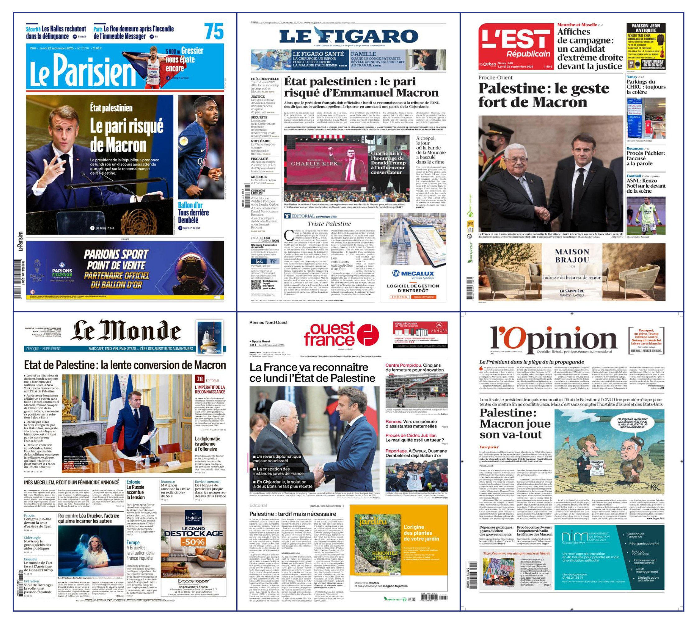 Plus ou moins suivistes à l’égard de la diplomatie française, les grands médias se rejoignent en tout cas, pour l’essentiel, sur un dernier biais journalistique très classique, facilement repérable sur les Unes du 22 septembre : l’ultra personnalisation de l’événement et la focalisation sur Emmanuel Macron, son « pari risqué », « sa lente conversion », sa « grande victoire diplomatique », son « geste fort ».