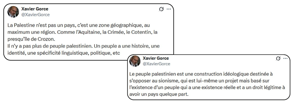 En niant ainsi l’existence même d’une population, ces toutologues se retrouvent de facto alignés sur la ligne du ministre fasciste israélien, Bezalel Smotrich, qui, de passage en France en mars 2023, déclarait déjà que « les Palestiniens n’existent pas, parce que le peuple palestinien n’existe pas » (Times of Israel, 20/03/23). Raphaël Enthoven s’était « contenté » de nier l’existence de journalistes palestiniens [1], Baverez et Gorce vont encore un cran plus loin.