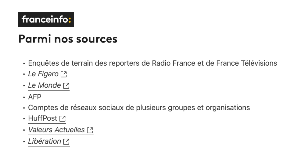L’AFP, les fameuses « enquêtes », les réseaux sociaux, des articles de 5 titres de presse, dans un joyeux pluralisme : Le Monde, Le Figaro, le Huffington Post, Libération et Valeurs Actuelles. En piochant aussi bien dans le « journal de référence » que dans un magazine d’extrême droite, on obtient normalement un consensus raisonnable… Duquel ne participent pas, à l’évidence, les médias et journalistes (pour la plupart indépendants) ayant pourtant publié les informations les plus fournies dans cette affaire [1]. Et pour cause : rappelons que pour la rédaction de France Info, un média comme Basta est « clairement marqué à gauche […] donc pas neutre », au contraire visiblement de Valeurs actuelles, clairement marqué à l’extrême droite et donc suffisamment « neutre » pour être revendiqué et légitimé en tant que source première par France Info. Là encore, le « double standard » est un instrument de mesure de phénomènes plus larges : dépolitisation… et droitisation.