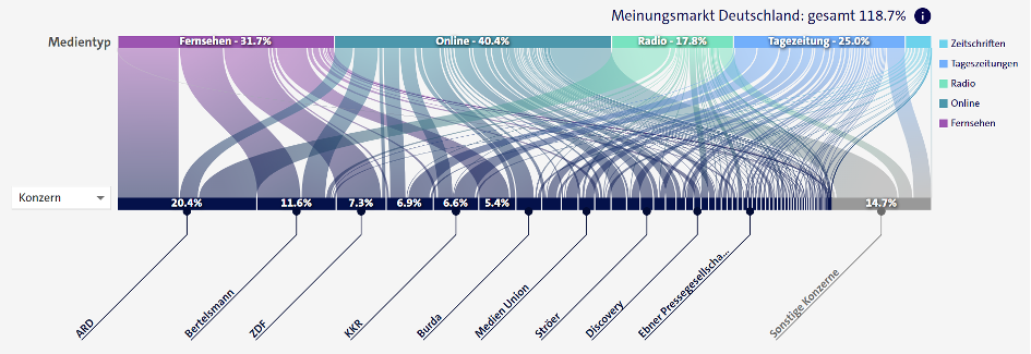 Selon le critère du « pouvoir d’opinion », tous médias confondus, les dix plus gros groupes de médias concourent pour 64,8 % à la formation de l’opinion allemande. Dans l’ordre : ARD (20,3%), Bertelsmann (11 %), ZDF (7,4%), Springer (6,8%), P7S1 (5,1%), Burda (3,5%), Funke (3,1 %), Madsack (2,9%), Medien Union (2,4%) et Bauer (2,3). Soit 27,7 % pour le public et 37,1 pour le privé. Ainsi, les médias hors des dix groupes majeurs contribuent-ils pour 35,2 % à la formation de l’opinion.