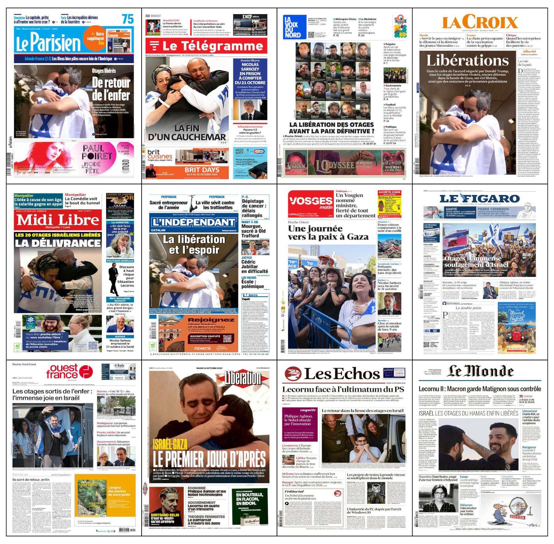 Dans le reste de la PQR, les titres en manchette prennent le relais de ce deux poids, deux mesures. « Israël-Gaza : otages libérés, enfin le jour d’après », titre Sud Ouest. « Otages libérés : vers une paix durable pour Gaza ? » s’interroge L’Écho républicain, sans visiblement mesurer la dissonance (et l’incongruité) à l’œuvre dans ce titre. Même tonalité, mêmes œillères en Une de L’Est éclair, sur un mode cette fois affirmatif : « Les 20 derniers otages israéliens libérés, l’espoir de paix renaît à Gaza ». Entre-soi au carré à La Charente Libre : « Israël et Trump célèbrent le retour des otages après 738 jours de captivité ». Et cette mention spéciale pour La Provence qui, sous le titre « Vingt otages vivants de retour en Israël », se fend de cet entrefilet : « Les vingt derniers otages vivants retenus par le Hamas ont été remis hier à Israël. Reportage avec la communauté juive de Marseille. » Un épisode anecdotique quoique significatif du lien effectué par les chefferies éditoriales entre Israéliens et « communauté juive » en France. Le point commun à tous ces titres ? Les Palestiniens n’y figurent pas. Ils ne sont pas un « événement ». Ils ne font pas partie de l’équation. Et ce ne sont pas les pages intérieures qui comblent le vide, où l’on comprend aisément, à la seule lecture des titres, où se porte l’attention journalistique. Comme dans le cas de Libération, les Palestiniens font au mieux l’objet de quelques lignes. Au pire, ce qui est plus souvent le cas, ils sont nulle part.