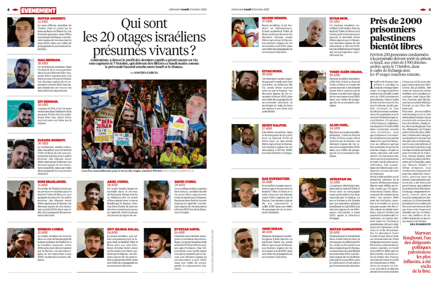 Sur la forme, d’abord : relégués en queue de peloton, les prisonniers palestiniens tiennent dans deux colonnes, presque à la marge. Le titre les dit « bientôt libres », mais la mise en scène les enferme sur un sixième de double page. Et cette cruelle disproportion parle d’elle-même, où, par contraste, les visages des uns disent la non-humanité des autres, les noms et les âges lisibles des uns disent l’inexistence des autres, les biographies des uns disent que les autres ne sont rien. Le journal donne aussi la mesure d’une architecture inversement proportionnelle : « 20 otages » d’un côté, « 2 000 prisonniers » de l’autre ; un rapport de 1 à 100 dans le réel et un rapport inverse de 1 à 6… dans la couverture journalistique.