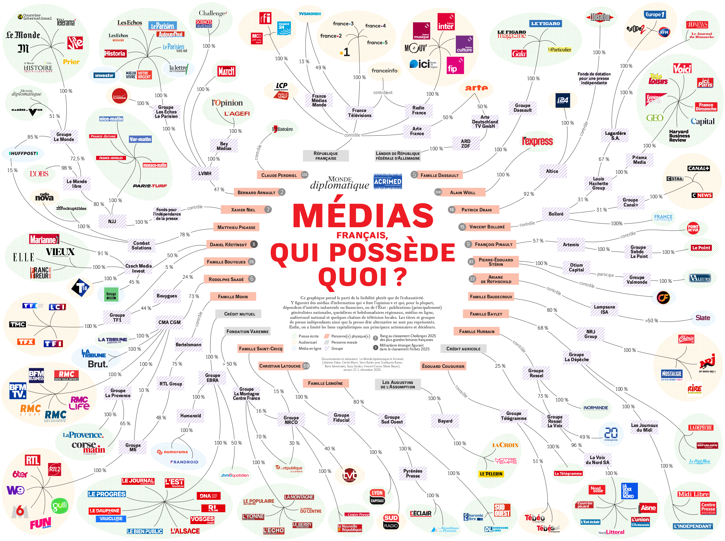 Nous publions une carte du paysage médiatique français, qui permet de démêler l’écheveau des concentrations dans la propriété des grands médias. Cette carte est le fruit d’un partenariat entre Acrimed et Le Monde diplomatique.