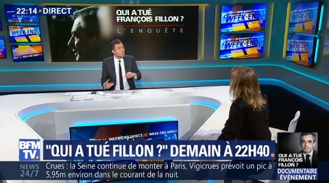 Mais Libération et Télérama sont loin d’être les seuls à avoir participé au tapage médiatique autour de ces documentaires. BFM-TV, chaîne productrice de « Qui a tué François Fillon ? » en a fait la promotion environ 120 fois en 24h [6] ! Une promotion intense lancée une semaine avant la première diffusion de « Qui a tué François Fillon ? » et qui s’est poursuivie les jours suivants. Une armada de commentateurs, de « chroniqueurs TV » et d’éditorialistes se sont ainsi attelés à paraphraser le documentaire au gré de « critiques » ou d’interviews des réalisateurs, sur BFM-TV comme dans la quasi totalité des grands médias [7].