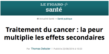 Lorsque des chercheurs d’une université de Marburg tentent de montrer que les patientes traitées pour un cancer du sein subissent d’autant plus les effets secondaires qu’elles les redoutent avant le début de la thérapie, il n’est pas évident que leurs travaux feront l’objet d’articles de publications aussi diverses que Le Figaro, RTL, Europe 1, allodocteurs.fr (le site de l’émission de France 5), repris sur le site de Francetvinfo, Femme actuelle, 20 minutes, La Nouvelle république, La Dépêche, Le Républicain lorrain, La République du centre, Ouest-France, France Soir, Sciences et avenir, doctissimo.fr, feminactu.com, topsante.com, e-santé.fr, actusante.net, pourquoidocteur.fr, 24matins.fr et speedylife.fr [1].