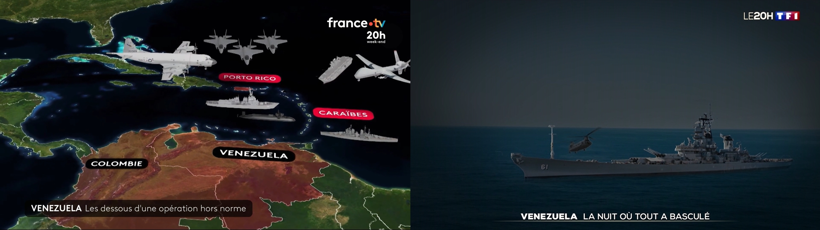 Dès le 3 janvier au matin, à bord de son Air Force One, Donald Trump avait lui-même impulsé ce registre lors d’une interview sur Fox News : « J’ai regardé l’opération, littéralement (sic), comme si c’était un show télévisé… Si vous aviez vu la vitesse, la violence ! […] Je n’avais jamais rien vu de pareil. » Aussi, de nombreux médias français vont se lancer dans le « film » des « opérations ». Ce format du récit minute par minute, mis en scène à grand renfort d’animations graphiques dans les JT, va se retrouver absolument partout, alimentant une spectacularisation de l’information aussi commode pour le pouvoir américain que pour les remplisseurs d’antenne.