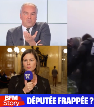 « Bonsoir madame, on découvre en même temps que je parle les images de ce week-end, et surtout des images qui vous montrent, vous, en train de franchir le barrage policier, en allant vers les gendarmes. On regarde et on écoute, et puis on les commente ensemble. » Sur le bandeau : « Députée frappée ? Une vidéo sème le trouble ». [2]