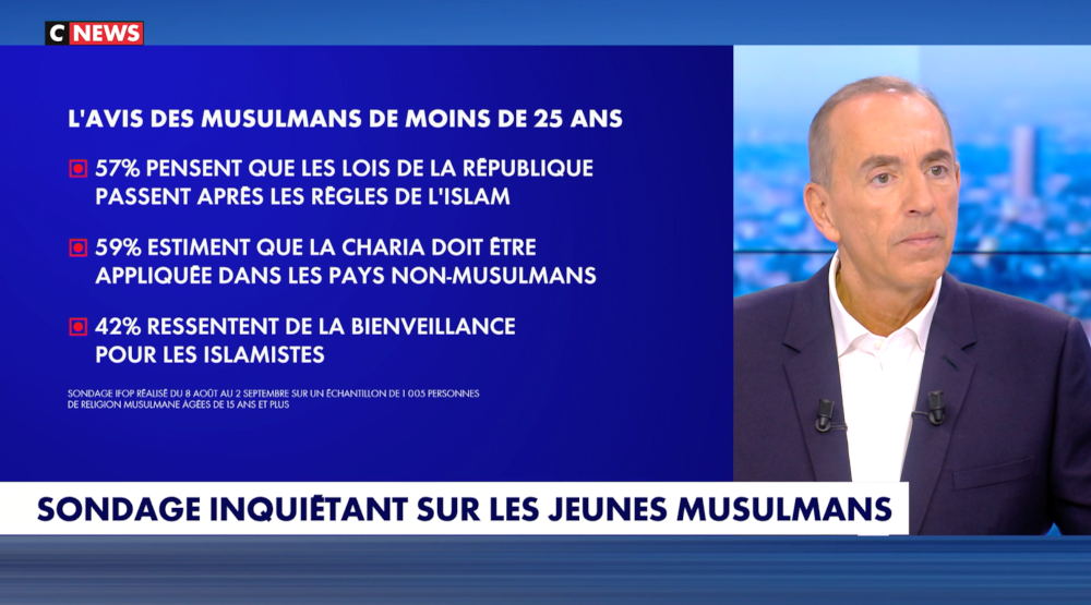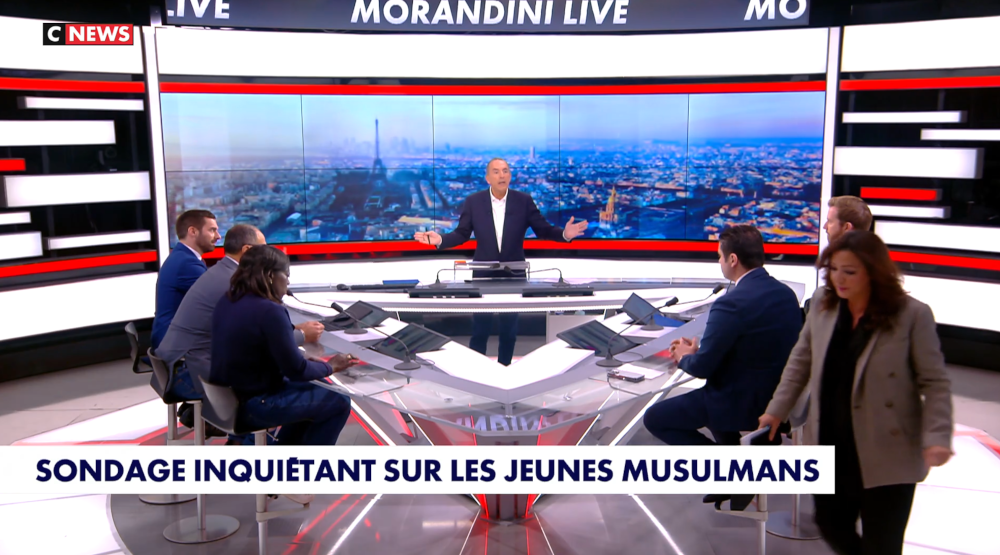 Morandini, ni personne d’autre sur le plateau, ne le précisera. L’animateur était semble-t-il trop occupé à rabrouer son invitée : « Quand le thermomètre dit de mauvaises choses, on casse le thermomètre en fait. » ; « Soyons sérieux ! » ; « Vous pouvez pas dire le sondage vaut rien parce qu’il vous plaît pas ! » ; « Là, c’est un sondage énorme, qui a été fait sur des centaines de personnes et on a retenu 1 000, qui étaient musulmanes en plus ! » ; « Mais enfin, c’est les sondages, c’est comme ça que ça se fait un sondage, vous dites n’importe quoi ! » ; « Arrêtez, vous répétez la même chose, vous êtes une machine à répéter la même chose ! » ; « Alors, je [ne] vous interroge plus. Je ne vous interroge plus. Je-ne-vous-interroge-plus ! » ; « Rachida Kaaout, essayez de répondre à ma question, autrement vous arrêtez de parler. » ; « Arrêtez, ça n’a aucun intérêt ce que vous dites… » ; « Arrêtez ! » ; « C’est pas parce que vous répétez 25 fois la même chose que c’est une vérité ! » ; « Vous répétez 25 fois n’importe quoi ! » ; « Stop ! » ; « Ça suffit ! »